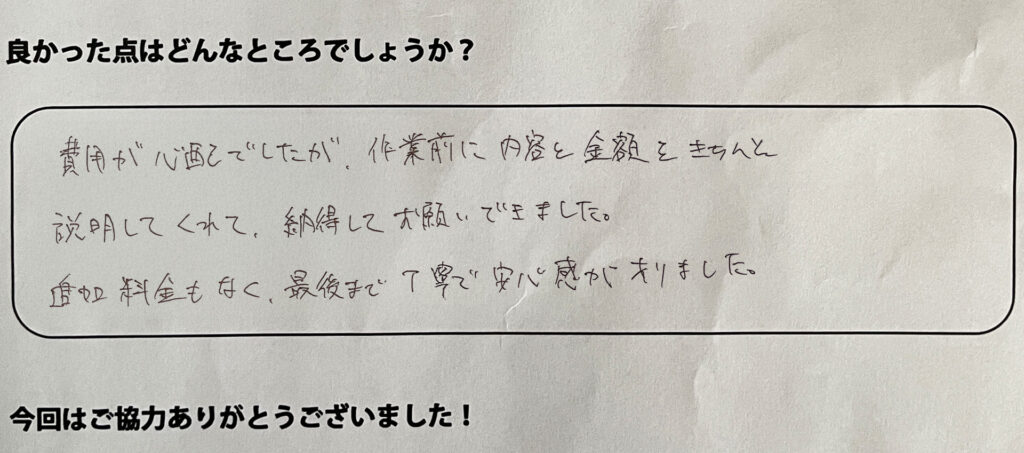 費用が心配でしたが、作業前に内容と金額をきちんと説明してくれて納得してお願いできました。追加料金もなく、最後まで丁寧で安心感がありました。
